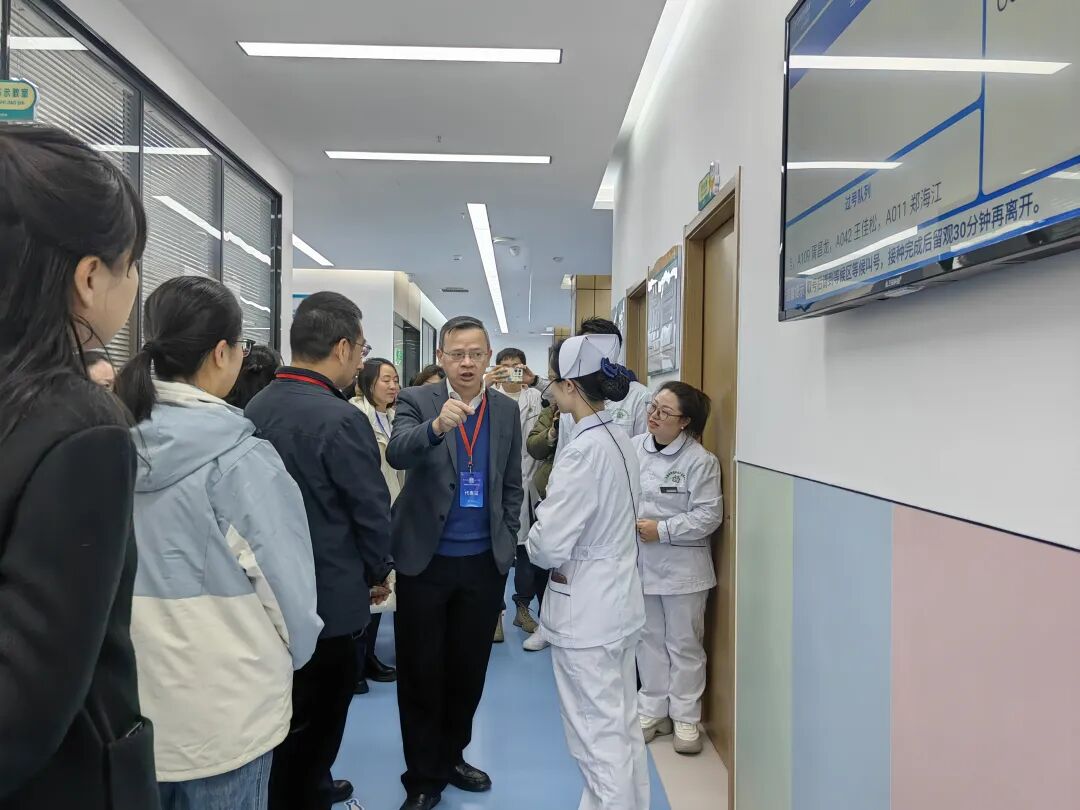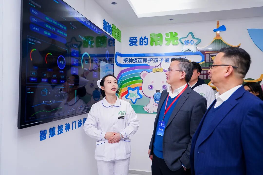 全智慧化接种门诊涵盖咨询—取号—预检—登记—候种—接种—留观—疑似预防接种异常反应处置,提供一站式自动智能可视化预防接种服务流程服务,运用数据和图形展示疫苗、冷链、排队、留观和消杀等信息,实现信息同步公开化,居民可体验到现代化便利的接种过程。一小时的参观时间结束后,各位专家们仍意犹未尽,交流讨论热烈,智慧化接种门诊得到了专家们一致的高度认可和赞许。