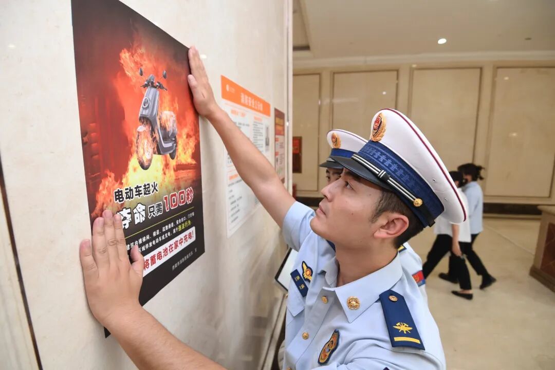9月17日,贵阳市南明区消防救援大队的消防员正在花果园M区楼道内张贴电动自行车火灾警示教育科普海报。