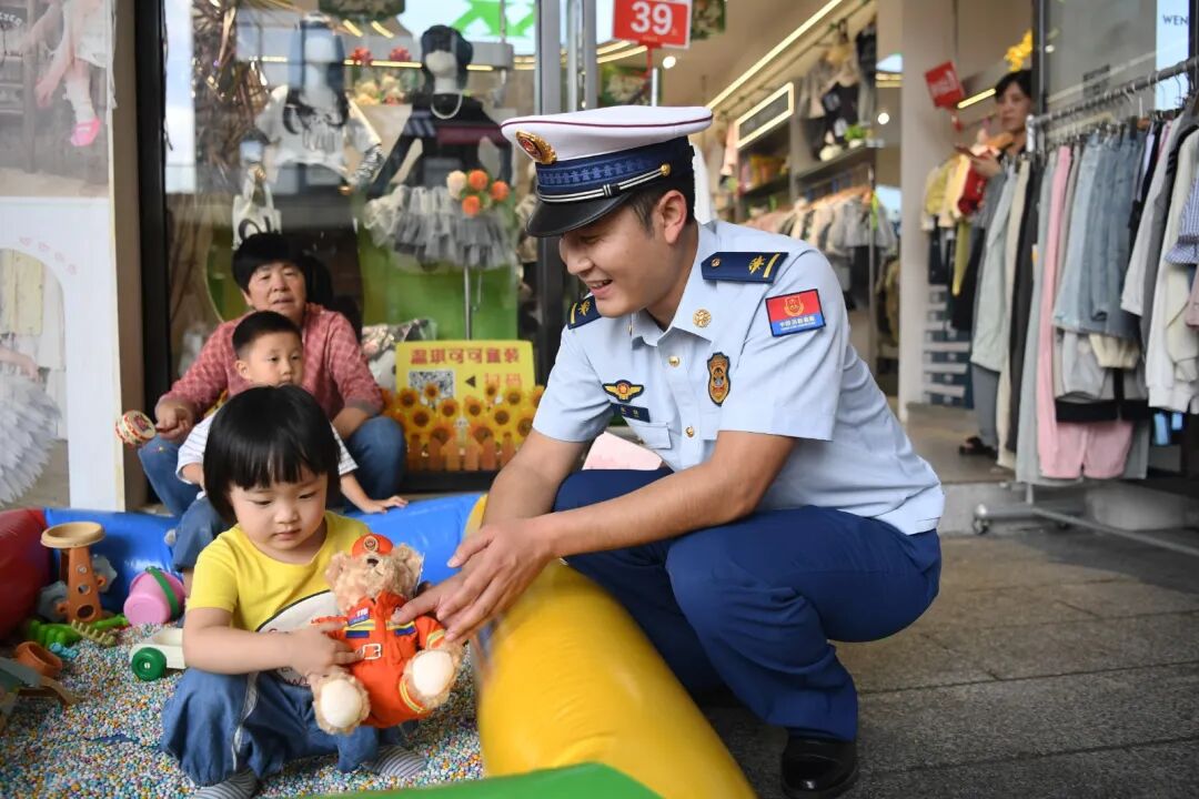 9月17日,区消防救援大队的消防员正在花果园M区开展消防安全宣传时给小朋友发放消防玩偶小熊。